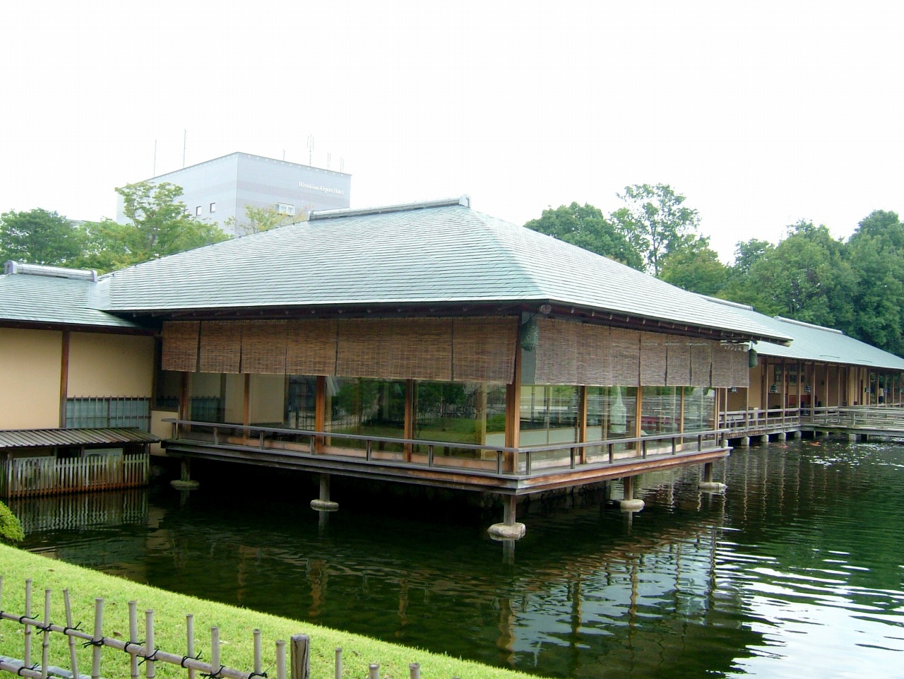 広島空港開港を記念して、1993年に造られた面積6haの築山池泉回遊式庭園。庭園は、3つのゾーンからできており1つは、自然林を生かした山のゾ-ン、そこから高低差約14mの滝『三段の滝』。次の里のゾーンには、竹林と梅林、ため池(里の池)、もみじ谷を配し、山里をイメ-ジした。もう1つの海のゾ-ン、大海と中島群、橋、それに数寄屋造風水上建築の庭園事務所(潮見亭)を配している。これは、宮島を連想した施設で、大海は、瀬戸内海を表したもの。このことから名称は山・里・海の3つの風景に因んで「三景園」と名付けられた。前撮りにも対応しており、アジサイや紅葉の時期が人気。