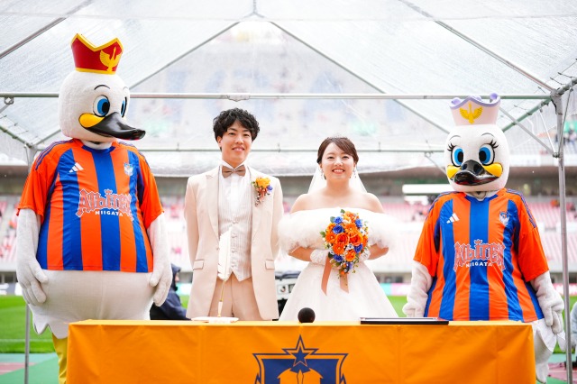2021年にサポーターカップルから手紙によるリクエストで誕生した、チームとオフィシャルクラブパートナーの同社とのコラボ企画。チームのモチーフである白鳥座二重星『アルビレオ』に合わせて『ビッグスワンウェディング』と題し、翌2022年までに4組のカップルの人前式をピッチ上で実施している。