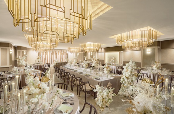 雰囲気の異なる5つのバンケットを備える同式場。今回はピンクを基調とし、“スウィート” なデザインで打ち出していたバンケット『フェアリー』を全面改装。グレージュカラーにしたほか、照明デザインを変更し、“大人かわいい”のイメージを追求するバンケットとした。トレンド、ニーズの変化への対応と、男性にもより支持されやすいデザインを目指した。