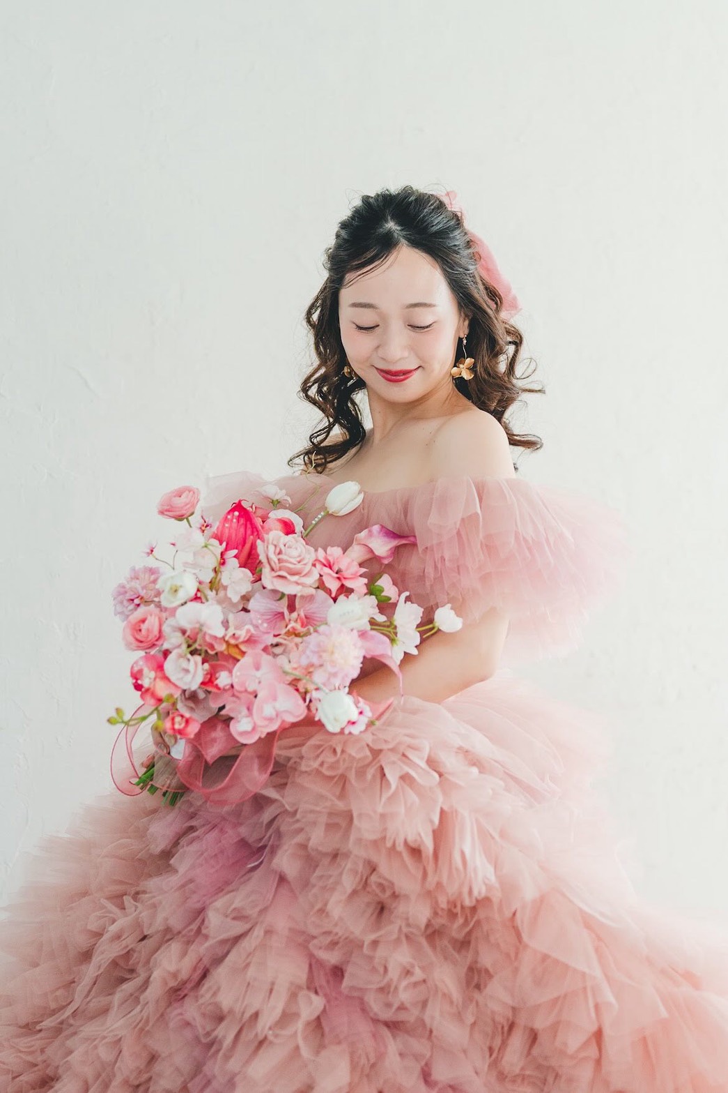 『オーダーメイドのウェディングブーケ』で中でも特に人気なのが、ピンク系の花材を中心に束ねたもの。甘くなりすぎない色合わせを意識し、胡蝶蘭、アンスリウム、カラーリリーなど、存在感のある花材を贅沢に使用する。ホテルウエディングからリゾート、海辺の挙式まで、幅広いシーンに映えるブーケとして人気が高い。すべてフルオーダーで制作し、花嫁一人ひとりのドレスや雰囲気、結婚式の世界観に合わせてデザインする。