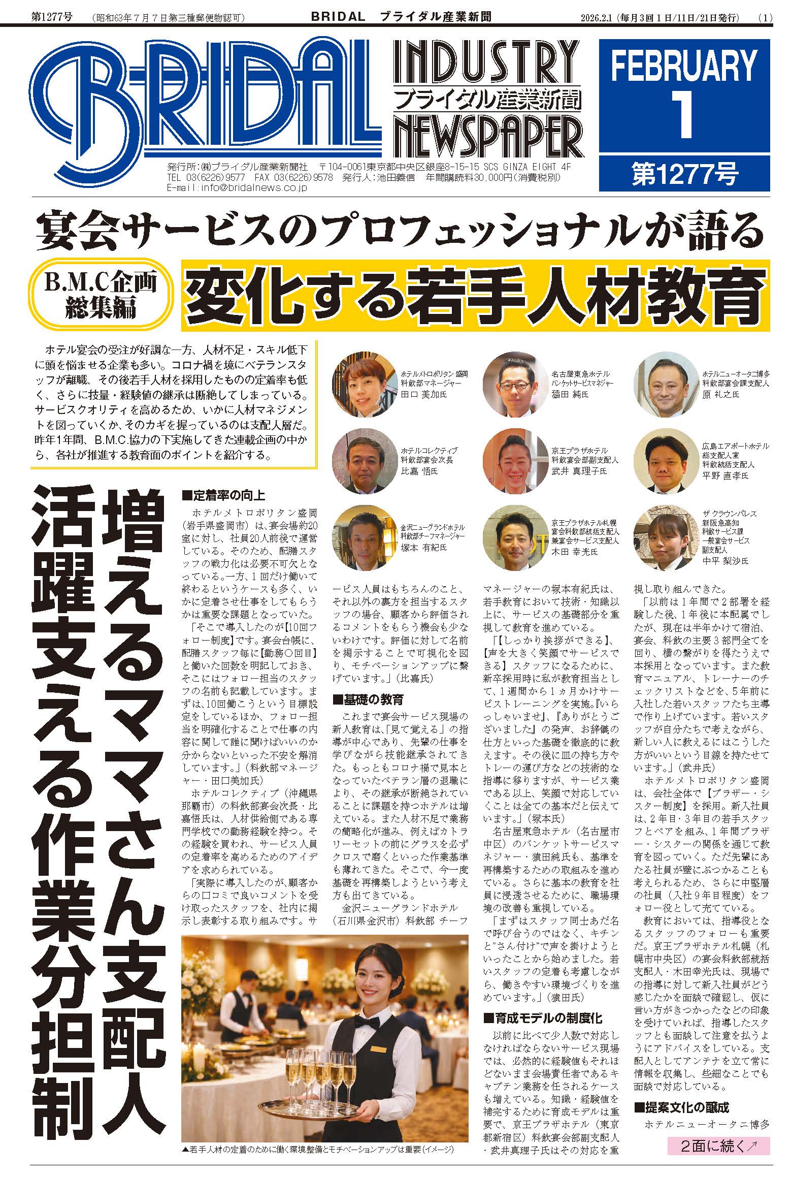 ホテル宴会の受注が好調な一方、人材不足・スキル低下に頭を悩ませる企業も多い。コロナ禍を境にベテランスタッフが離職、その後若手人材を採用したものの定着率も低く、さらに技量・経験値の継承は断絶してしまっている。サービスクオリティを高めるため、いかに人材マネジメントを図っていくか、そのカギを握っているのは支配人層だ。昨年1年間、B.M.C.協力の下実施してきた連載企画の中から、各社が推進する教育面のポイントを紹介する。