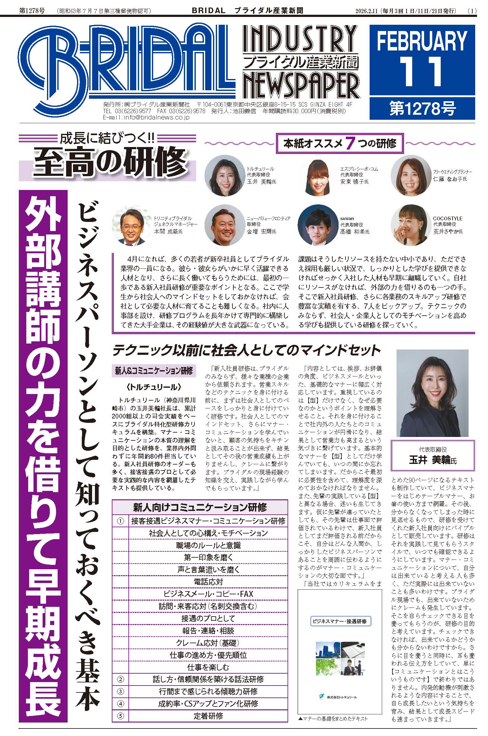 4月になれば、多くの若者が新卒社員としてブライダル業界の一員になる。彼ら・彼女らがいかに早く活躍できる人材となり、さらに長く働いてもらうためには、最初の一歩である新入社員研修が重要なポイントとなる。ここで学生から社会人へのマインドセットをしておかなければ、会社として必要な人材に育てることも難しくなる。社内に人事部を設け、研修プログラムを長年かけて専門的に構築してきた大手企業は、その経験値が大きな武器になっている。課題はそうしたリソースを持たない中小であり、ただでさえ採用も厳しい状況で、しっかりとした学びを提供できなければせっかく入社した人材も早期に離職していく。自社にリソースがなければ、外部の力を借りるのも一つの手。そこで新入社員研修、さらに各業務のスキルアップ研修で豊富な実績を有する、7人をピックアップ。テクニックのみならず、社会人・企業人としてのモチベーションを高める学びも提供している研修を探っていく。