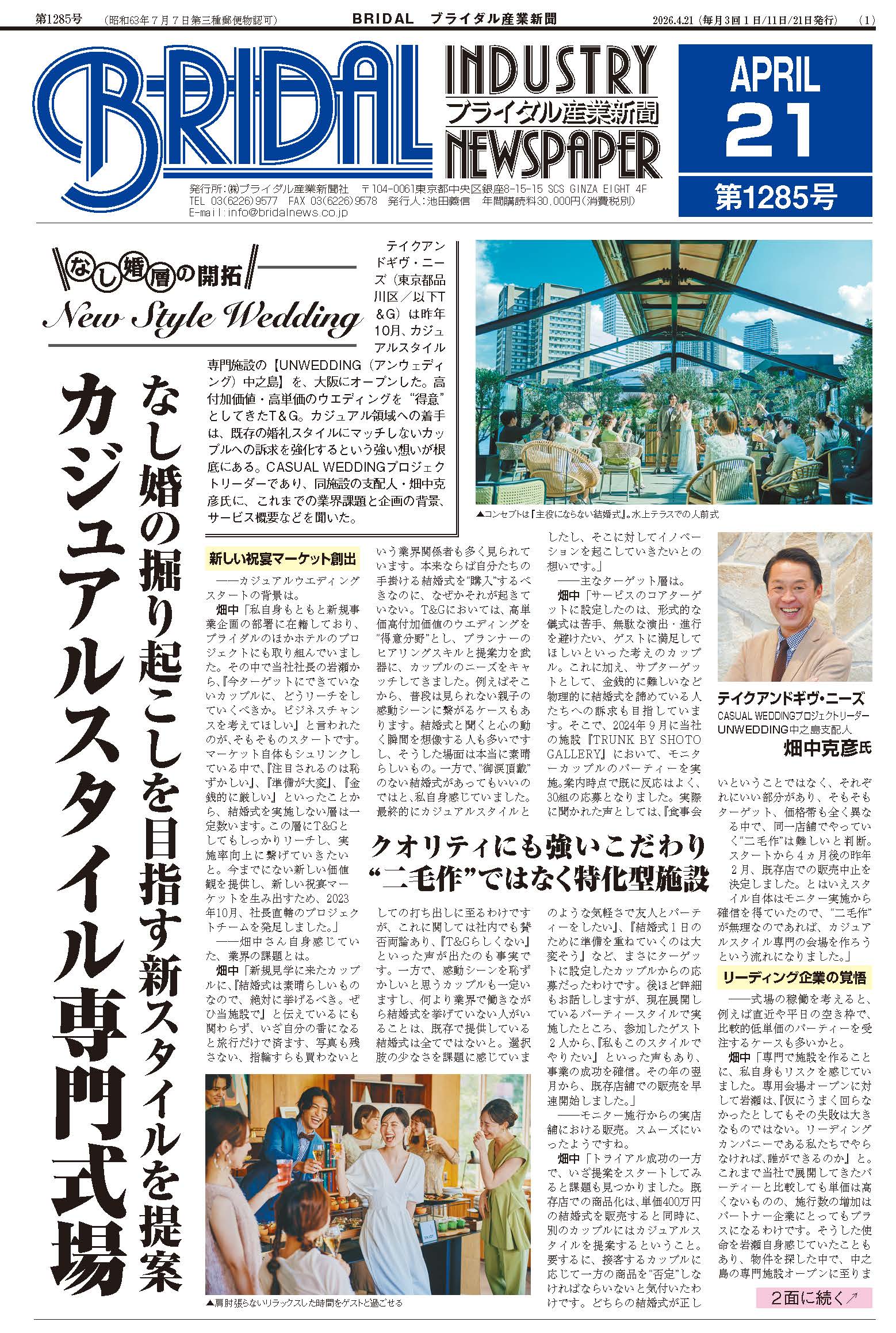 テイクアンドギヴ・ニーズ(東京都品川区/以下T&G)は昨年10月、カジュアルスタイル専門施設の【UNWEDDING (アンウェディング)中之島】を、大阪にオープンした。高付加価値・高単価のウエディングを“得意”としてきたT&G。カジュアル領域への着手は、既存の婚礼スタイルにマッチしないカップルへの訴求を強化するという強い想いが根底にある。CASUAL WEDDINGプロジェクトリーダーであり、同施設の支配人・畑中克彦氏に、これまでの業界課題と企画の背景、サービス概要などを聞いた。
