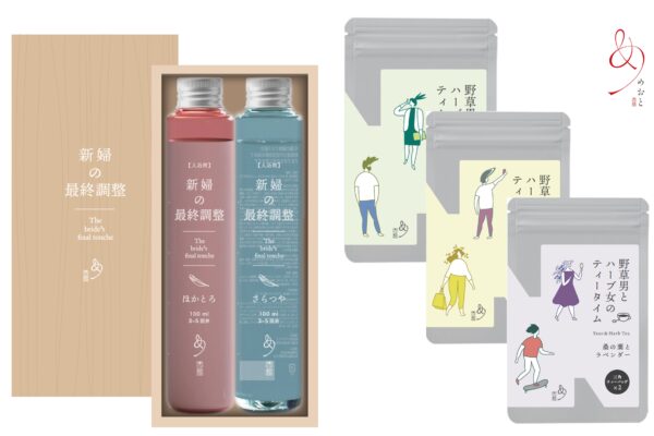 - 新作アイテムは2種類。一つは「新婦の最終調整」という入浴剤。商品名のごとく従来の入浴剤にはない保湿力が魅力。2色の入浴剤を桐箱に入れた、引出物にオススメのアイテム。もう一つは「野草男とハーブ女のティータイム」というお茶。野草とハーブを1 種類ずつブレンドし、男女の出会いに見立てたプチギフト。